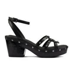 Back for another season, our best-selling wedge profile returns with a new square toe in Maritsa 70 Sun. Metal stud detail adds a contemporary twist to premium black leather straps, while a high cork wedge and cushioned footbed.