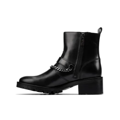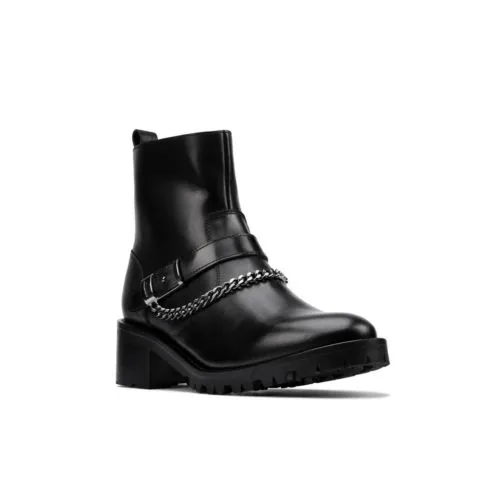 A fresh take on the ankle boot, this contemporary style makes the most of embellishments with chain and buckle detailing on the smooth black leather upper. Chunky grooves in the sole add to the edgy character while an inside zip gives easy foot entry. Heel height: 4cm