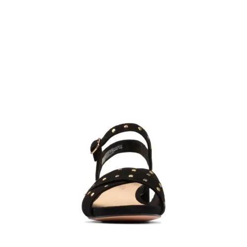 Add some glitz to party outfits with this chic studded sandal. As well as the elegant strappy upper, this suede style features an adjustable buckle fastening, slightly flared 3.5cm block heel and resin rubber sole.