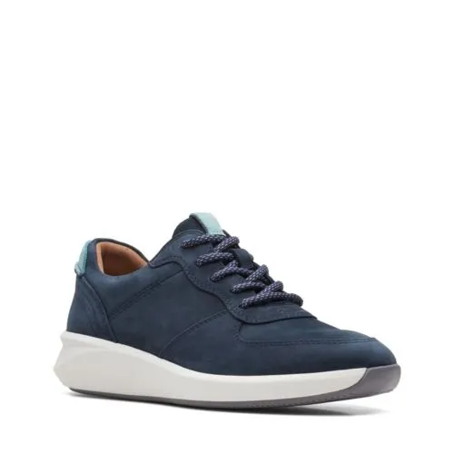 A sleek silhouette and athletic aesthetic define contemporary trainer Un Rio Sprint. Soft navy nubuck with neutral accents creates a casual track-inspired design, and the flexible sole has plenty of traction, without bulk or weight,